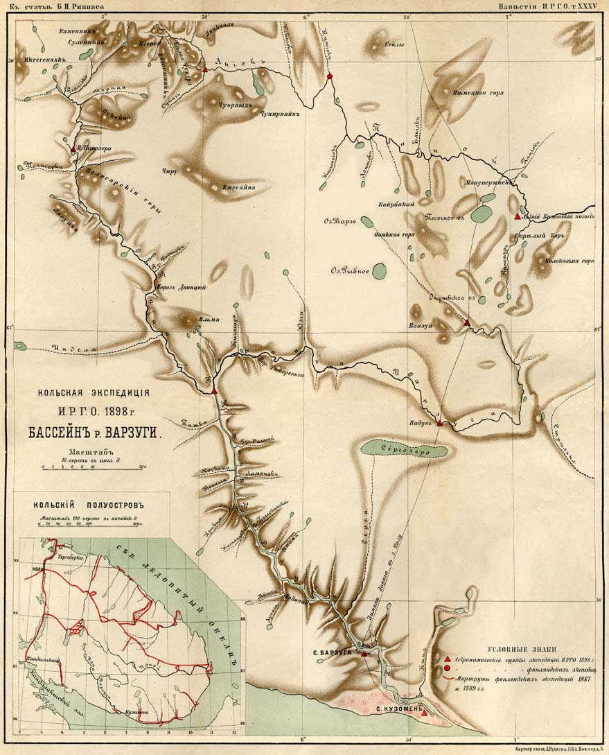 Из отчета Риппаса. Кольская экспедиция 1898 года (Справа карта бассейна Варзуги, составленная по итогам экспедиции):